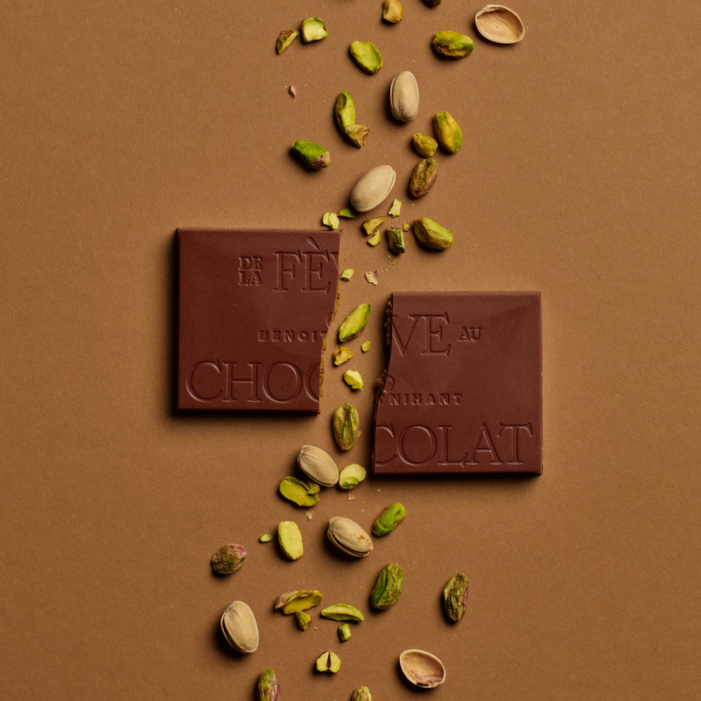 Sous sa fine coque de chocolat au lait intense, cette tablette cache un praliné maison aux pistaches relevé d’éclats de crêpe dentelle. Un équilibre parfait entre fondant et croquant, pour une gourmandise légère et peu sucrée — la version signée Benoît Nihant d’un grand classique revisité avec élégance.