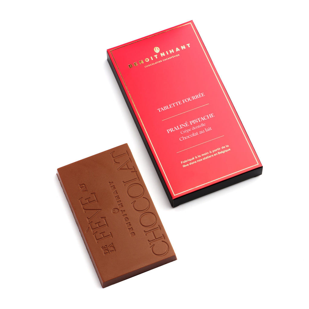 Tablette au chocolat au lait fourrée de praliné pistaches et crêpe dentelle