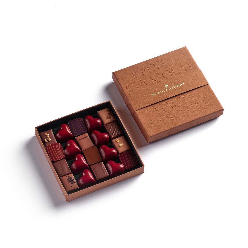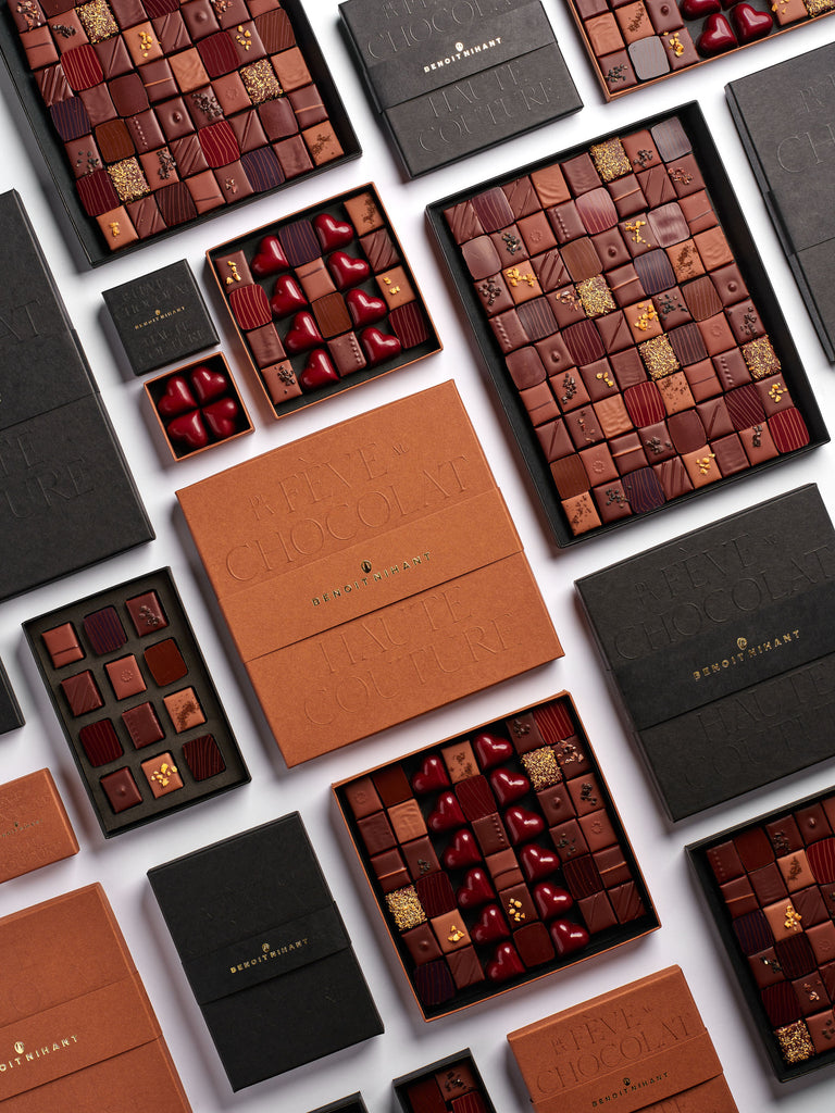 Au sein du coffret, des Grands Crus natures, originaires des quatre coins du globe, côtoient des palets pralinés maison, des ganaches noires de caractère rehaussées de fruits, d’infusion de thé, des ganaches au lait, des caramels à la fleur de sel et de la pâte d'amande.